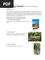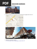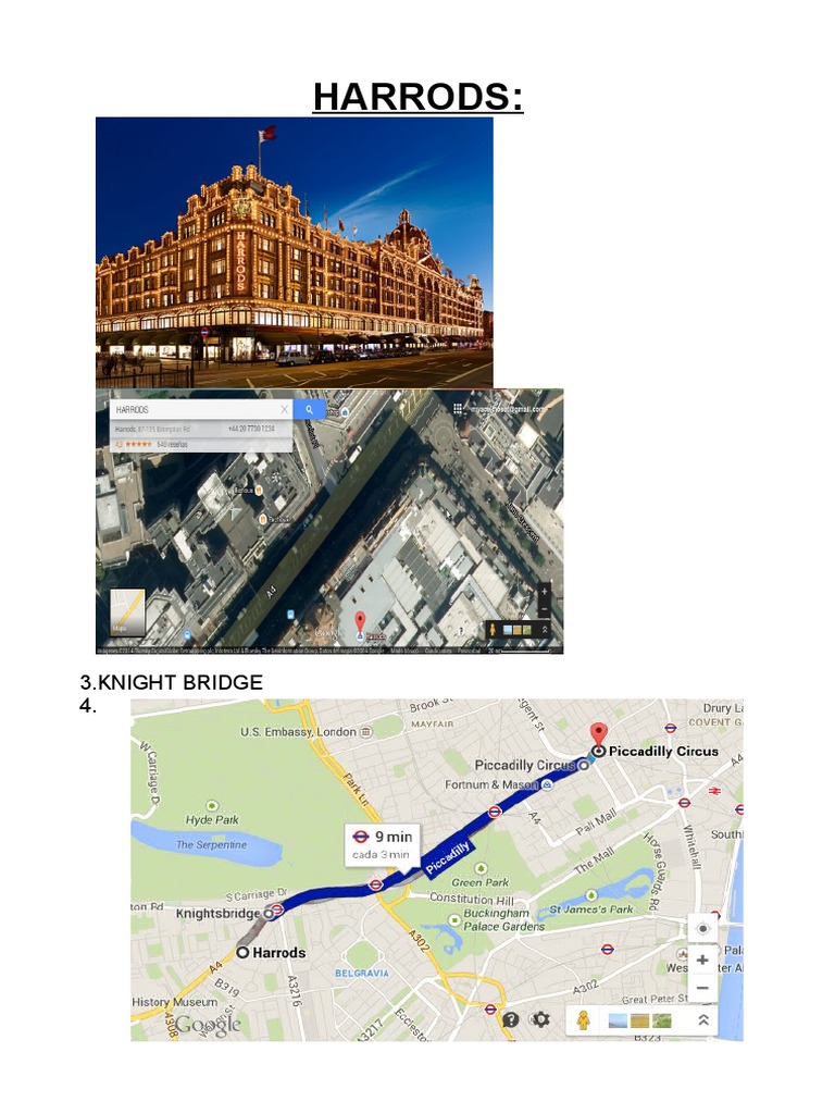 Harrods is a department store located on Knight Bridge in London that is open Monday to Saturday from 10:00 am to 9:00 pm and Sunday from 11:30 am to 6:00 pm. The document also mentions Standford stadium, Hide Park, Buckingham Palace Gardens, and that Lady Di and Dodi Al.Fayed spent time there.