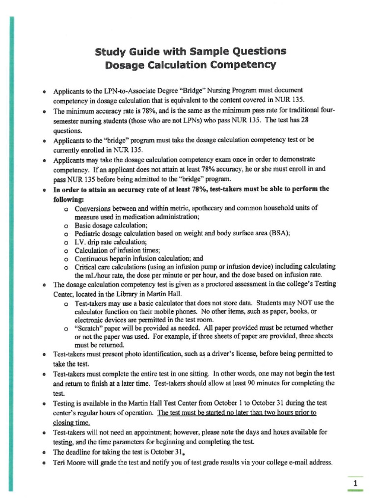 ‘competency in dosage calculation that is equivalent to the content covered in NUR 135.