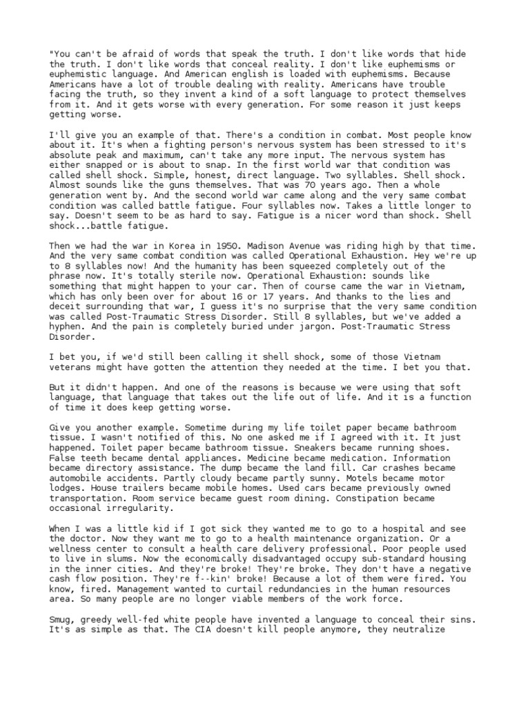 "You can't be afraid of words that speak the truth. I don't like words that hidethe truth. I don't like words that conceal reality. I don't like euphemisms oreuphemistic language. And American english is loaded with euphemisms. BecauseAmericans have a lot of trouble dealing with reality. Americans have troublefacing the truth, so they invent a kind of a soft language to protect themselvesfrom it. And it gets worse with every generation. For some reason it just keepsgetting worse.I'll give you an example of that. There's a condition in combat. Most people knowabout it. It's when a fighting person's nervous system has been stressed to it'sabsolute peak and maximum, can't take any more input. The nervous system haseither snapped or is about to snap. In the first world war that condition wascalled shell shock. Simple, honest, direct language. Two syllables. Shell shock.Almost sounds like the guns themselves. That was 70 years ago. Then a wholegeneration went by. And the second world war came along and the very same combatcondition was called battle fatigue. Four syllables now. Takes a little longer tosay. Doesn't seem to be as hard to say. Fatigue is a nicer word than shock. Shellshock...battle fatigue.Then we had the war in Korea in 1950. Madison Avenue was riding high by that time.And the very same combat condition was called Operational Exhaustion. Hey we're upto 8 syllables now! And the humanity has been squeezed completely out of thephrase now. It's totally sterile now. Operational Exhaustion: sounds likesomething that might happen to your car. Then of course came the war in Vietnam,which has only been over for about 16 or 17 years. And thanks to the lies anddeceit surrounding that war, I guess it's no surprise that the very same conditionwas called Post-Traumatic Stress Disorder. Still 8 syllables, but we've added ahyphen. And the pain is completely buried under jargon. Post-Traumatic StressDisorder.I bet you, if we'd still been calling it shell shock, some of those Vietnamveterans might have gotten the attention they needed at the time. I bet you that.But it didn't happen. And one of the reasons is because we were using that softlanguage, that language that takes out the life out of life. And it is a functionof time it does keep getting worse.Give you another example. Sometime during my life toilet paper became bathroomtissue. I wasn't notified of this. No one asked me if I agreed with it. It justhappened. Toilet paper became bathroom tissue. Sneakers became running shoes.False teeth became dental appliances. Medicine became medication. Informationbecame directory assistance. The dump became the land fill. Car crashes becameautomobile accidents. Partly cloudy became partly sunny. Motels became motorlodges. House trailers became mobile homes. Used cars became previously ownedtransportation. Room service became guest room dining. Constipation becameoccasional irregularity.When I was a little kid if I got sick they wanted me to go to a hospital and seethe doctor. Now they want me to go to a health maintenance organization. Or awellness center to consult a health care delivery professional. Poor people usedto live in slums. Now the economically disadvantaged occupy sub-standard housingin the inner cities. And they're broke! They're broke. They don't have a negativecash flow position. They're f--kin' broke! Because a lot of them were fired. Youknow, fired. Management wanted to curtail redundancies in the human resourcesarea. So many people are no longer viable members of the work force.Smug, greedy well-fed white people have invented a language to conceal their sins.It's as simple as that. The CIA doesn't kill people anymore, they neutralize