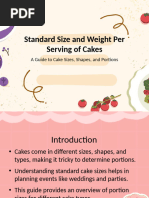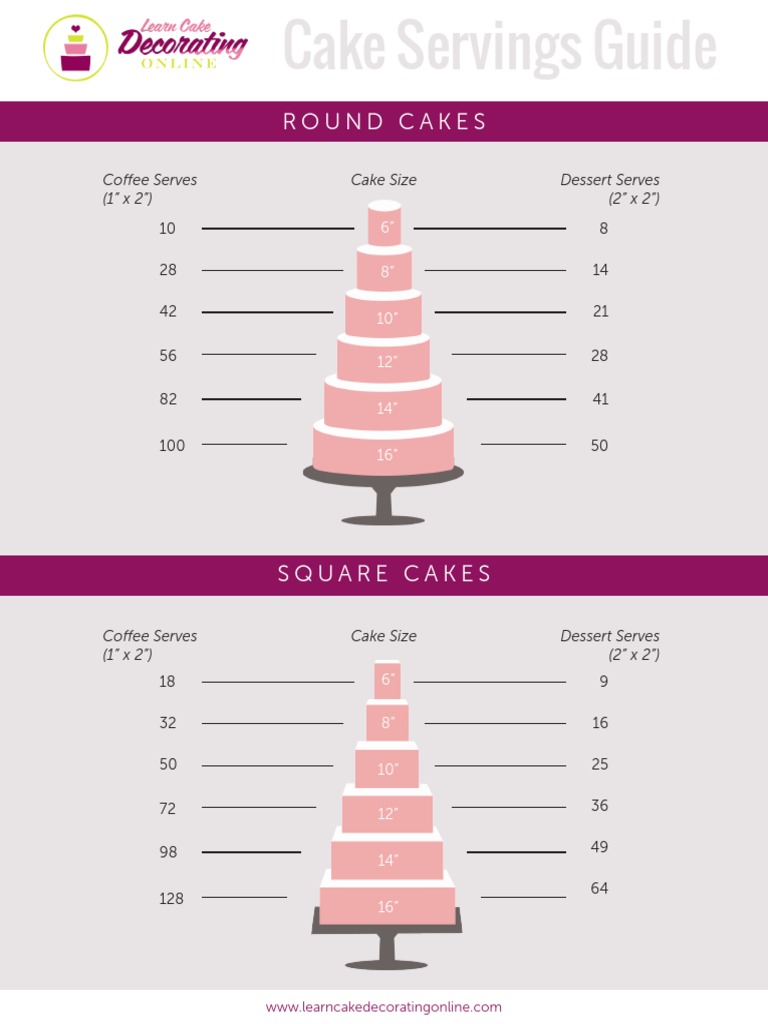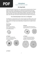 This document provides a cake servings guide for round and square cakes of various sizes from 6" to 16". It lists the number of 1" by 2" coffee servings and 2" by 2" dessert servings that each cake size will provide. Larger cakes serve more people, with a 16" round cake serving 50 coffee slices or 100 dessert slices and a 16" square cake serving 64 coffee slices or 128 dessert slices. The guide is intended to help bakers determine how many people a cake will serve based on its shape and dimensions.