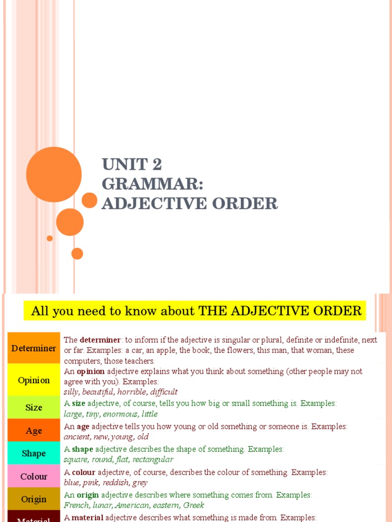 The determiner: to inform if the adjective is singular or plural, definite or indefinite, next