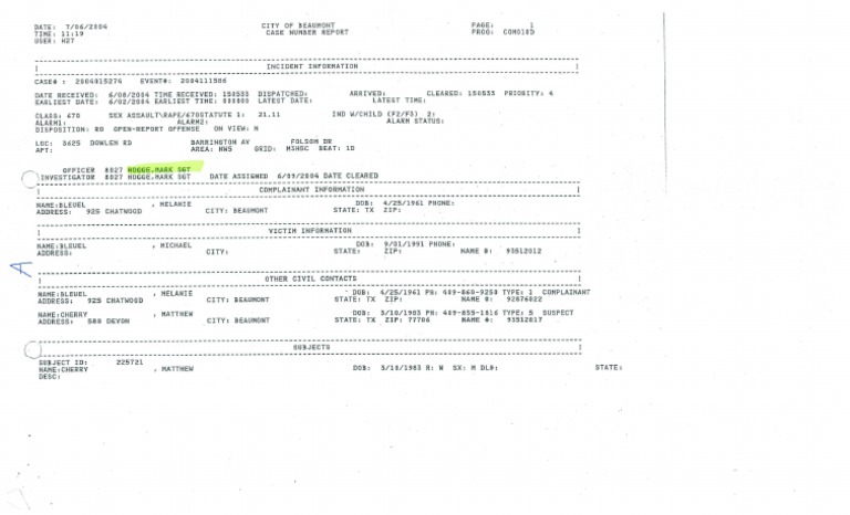 "Incident Information" Report by Beaumont PD Sgt. Det. Mark Hogge