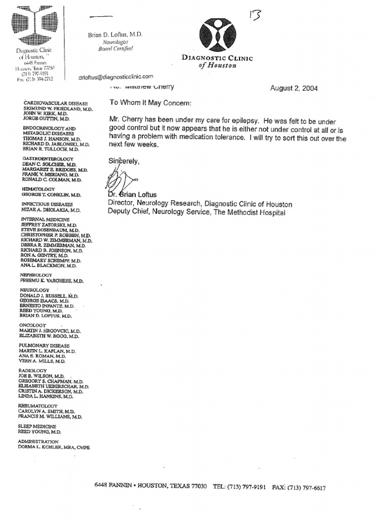 Dr. Brian Loftus Letter re: Matthew Cherry's Epilepsy