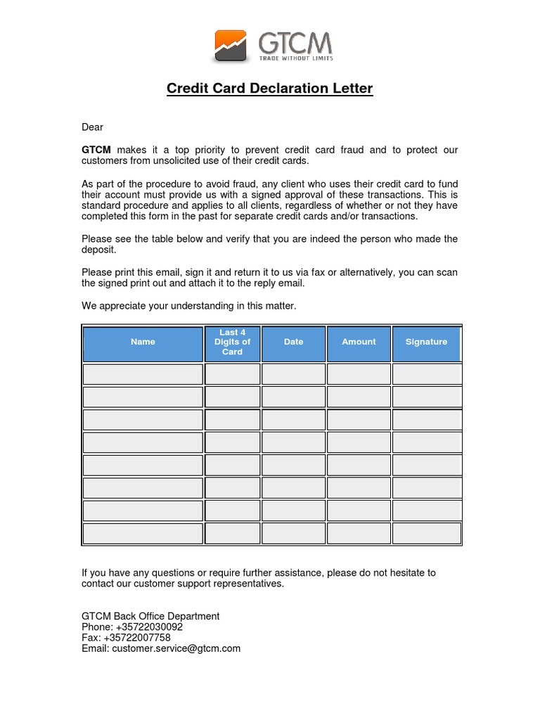 Credit Card Declaration Letter