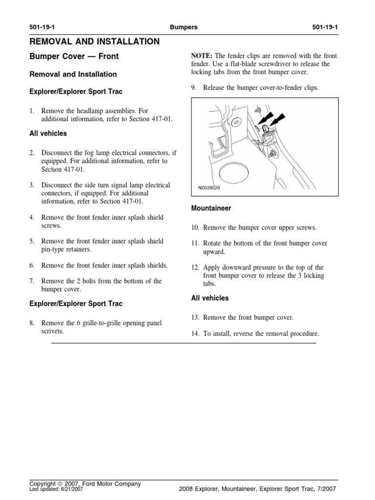 The fender clips are removed with the front fender. Use a flat-blade screwdriver to release the locking tabs from the front bumper cover.