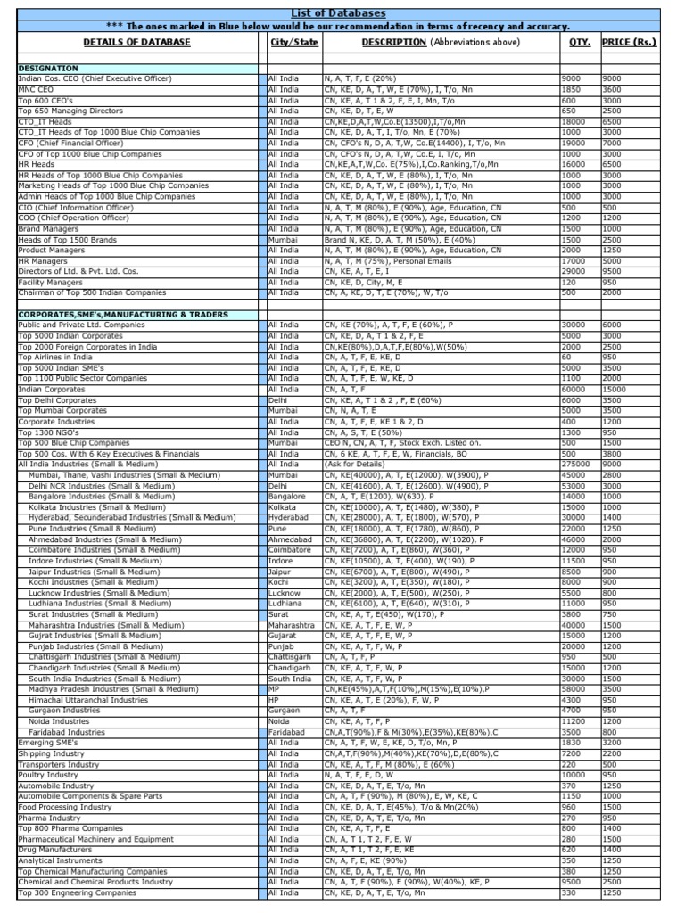 Marketing Heads of Top 1000 Blue Chip Companies All India CN, KE, D, A, T, W, E (80%), I, T/o, Mn 1000 3000