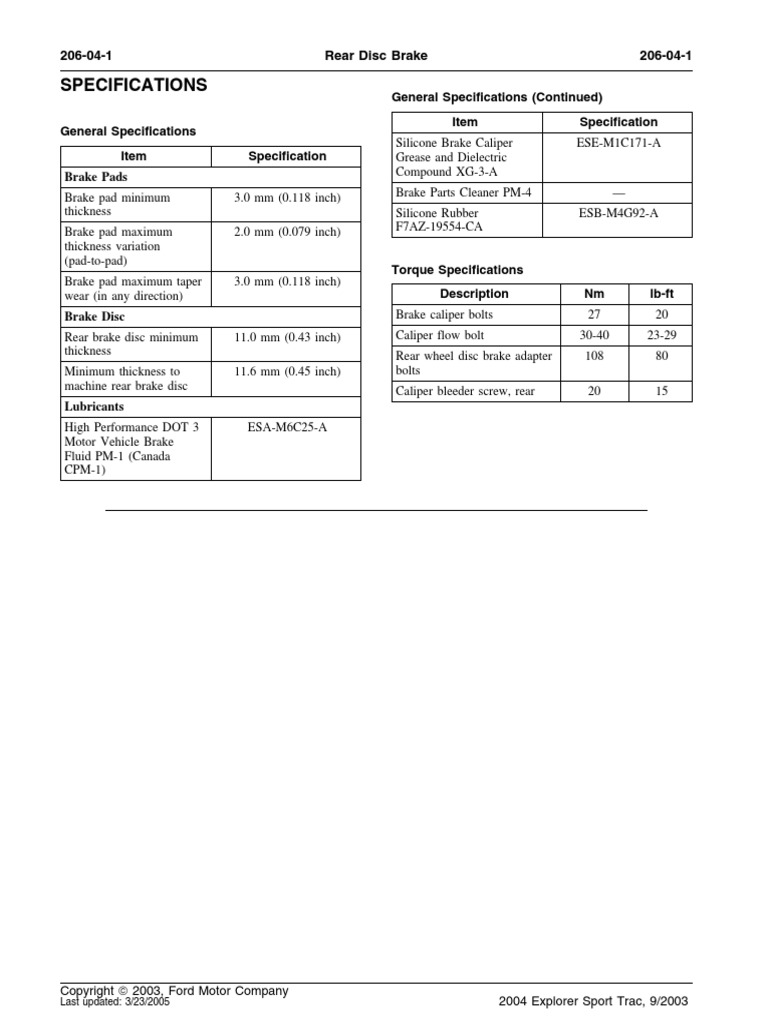 Rear Disc Brake SPECIFICATIONS (Continued) Item General Specifications Item Specification Brake Pads Specification Silicone Brake Caliper Grease and Dielectric Compound XG-3-A brake pad minimum thickness Brake Parts Cleaner PM-4 brake pad maximum thickness variation (pad-to-pad) Silicone Rubber F7AZ-19554-CA brake pad maximum taper wear (in any direction) Torque Specifications Description Brake caliper bolts