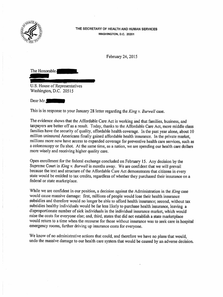 This is in response to your January 28 letter regarding the King v. Burwell case.