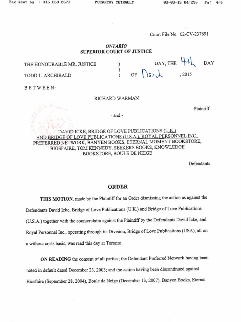 actionasagainsttheDefendantsDavidIcke,BridgeofLovePublications U.K.)andBridgeofLovePublications