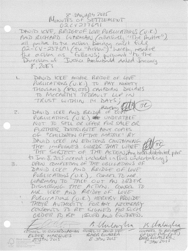 Out of court settlement terms of the libel action by Canadian human rights lawyer Richard Warman against British conspiracy writer David Icke. Dated 8 January 2015.