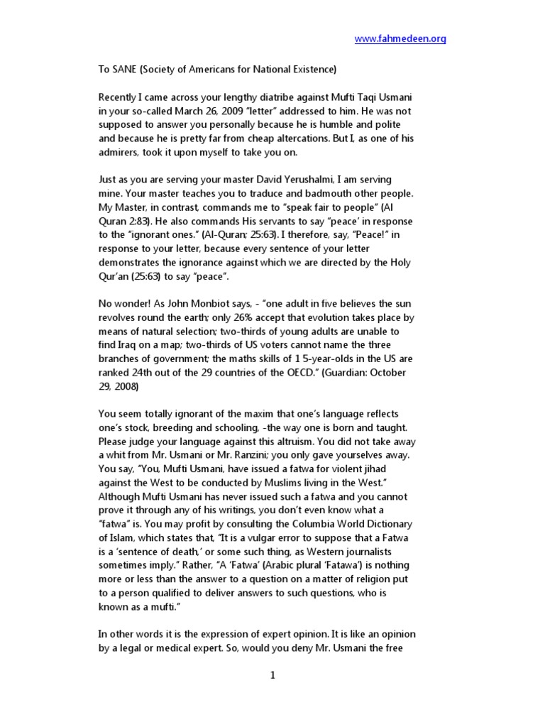 Recently I came across your lengthy diatribe against Mufti Taqi Usmani