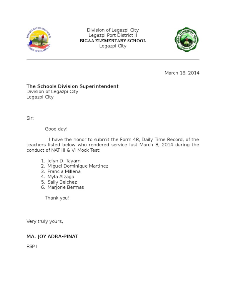 I have the honor to submit the Form 48, Daily Time Record, of the