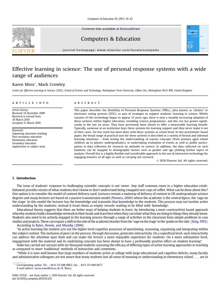 Kay, R. H., & LeSage, A. (2009). Examining the benets and challenges of using audience response systems: a review of the literature. Computers & Education, 53(3), 819827.