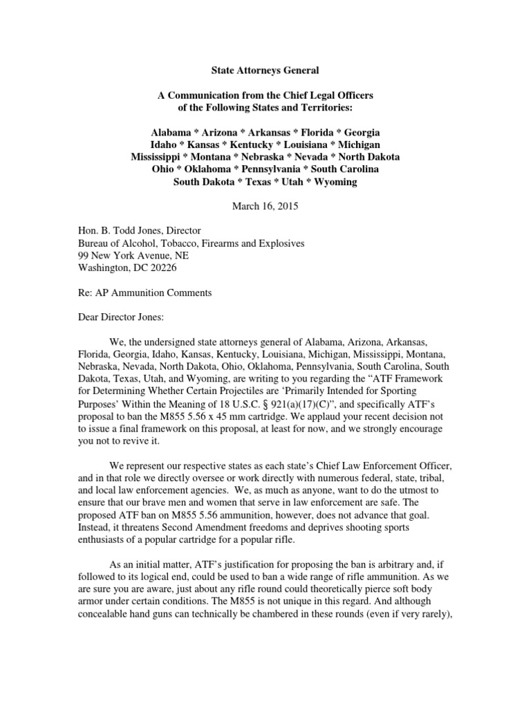 March 16, 2015 Hon. B. Todd Jones, Director Bureau of Alcohol, Tobacco, Firearms and Explosives 99 New York Avenue, NE Washington, DC 20226 Re: AP Ammunition Comments Dear Director Jones: We, the undersigned state attorneys general of Alabama, Arizona, Arkansas, Florida, Georgia, Idaho, Kansas, Kentucky, Louisiana, Michigan, Mississippi, Montana, Nebraska, Nevada, North Dakota, Ohio, Oklahoma, Pennsylvania, South Carolina, South Dakota, Texas, Utah, and Wyoming, are writing to you regarding the “ATF Framework for Determining Whether Certain Projectiles are ‘Primarily Intended for Sporting Purposes’ Within the Meaning of 18 U.S.C.