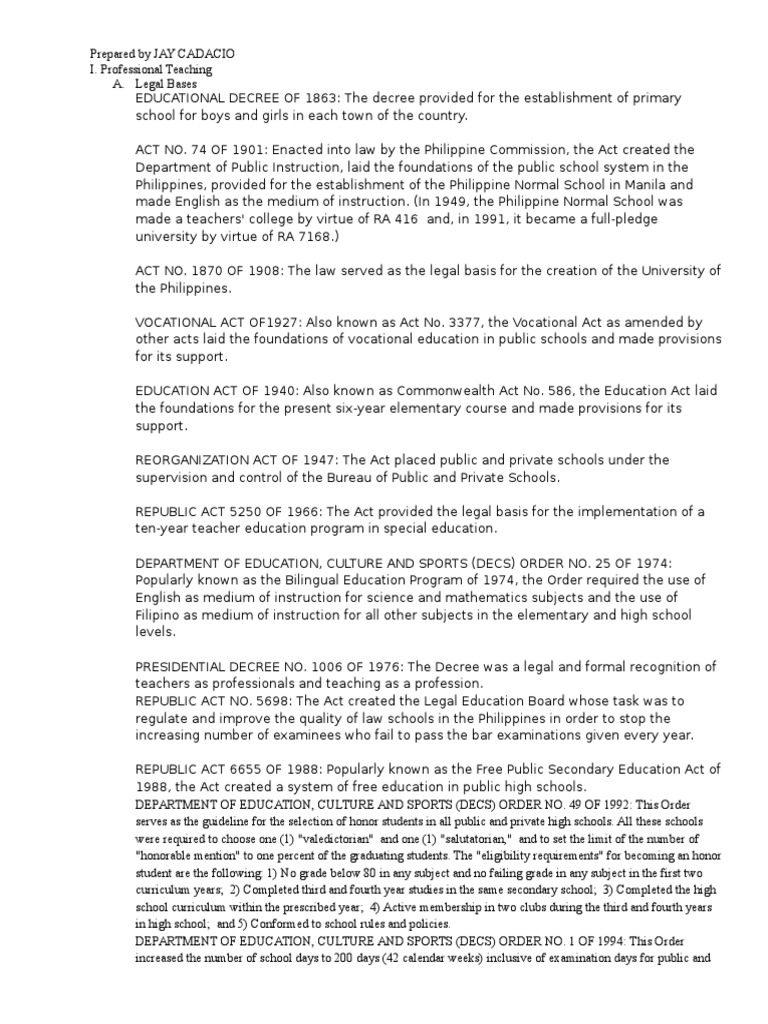 REPUBLIC ACT NO. 7836 OF 1994: Known as the Philippine Teachers Professionalization Act of 1994, the Act