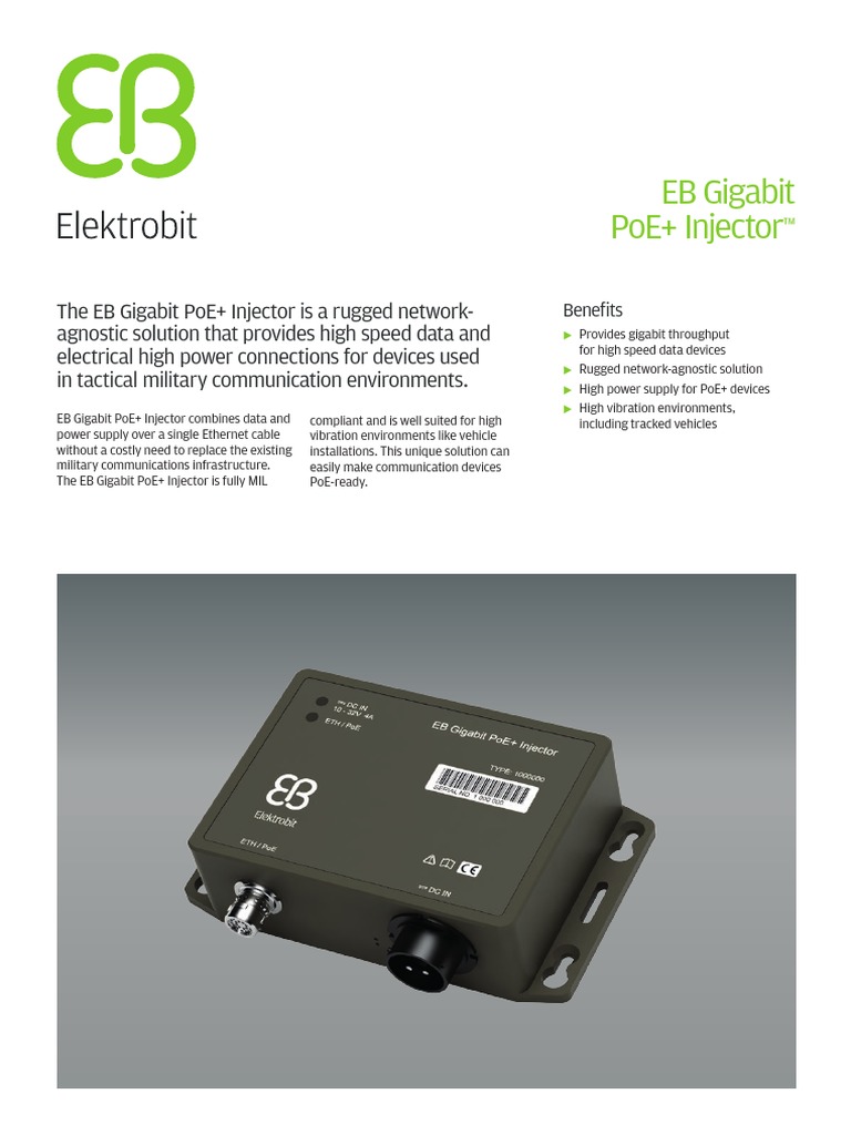 The EB Gigabit PoE+ Injector is a rugged networkagnostic solution that provides high speed data and