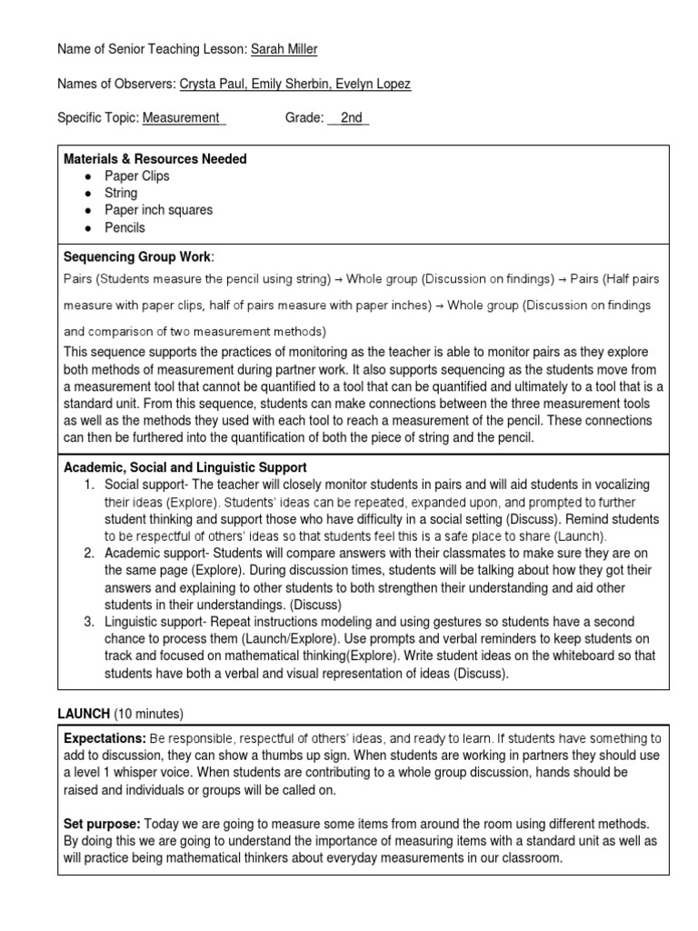 measure with paper clips, half of pairs measure with paper inches) Whole group (Discussion on findings