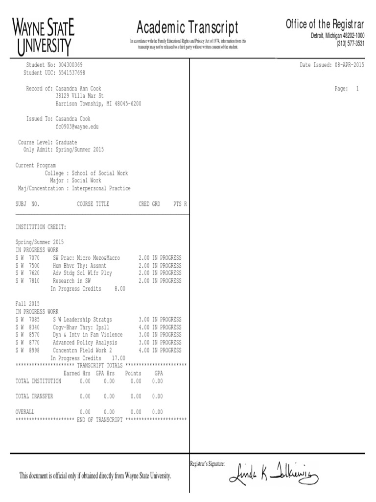 Office of the Registrar at Wayne State University at (313) 577-3531
