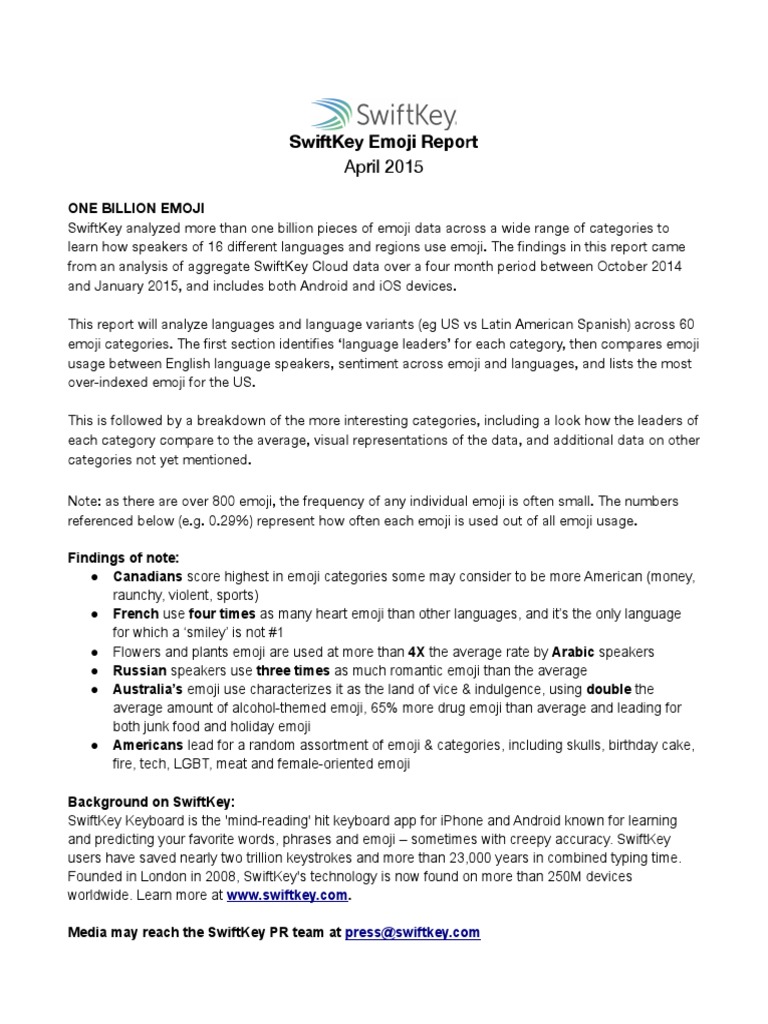 Ever wondered what your emoji say about you? Or how different nationality use emoji differently, from the United States to France to Turkey? We tapped into the SwiftKey Cloud vaults and analyzed more than a billion emoji used by speakers of 16 languages around the world to answer these very questions - and many more - in SwiftKey’s first emoji report.