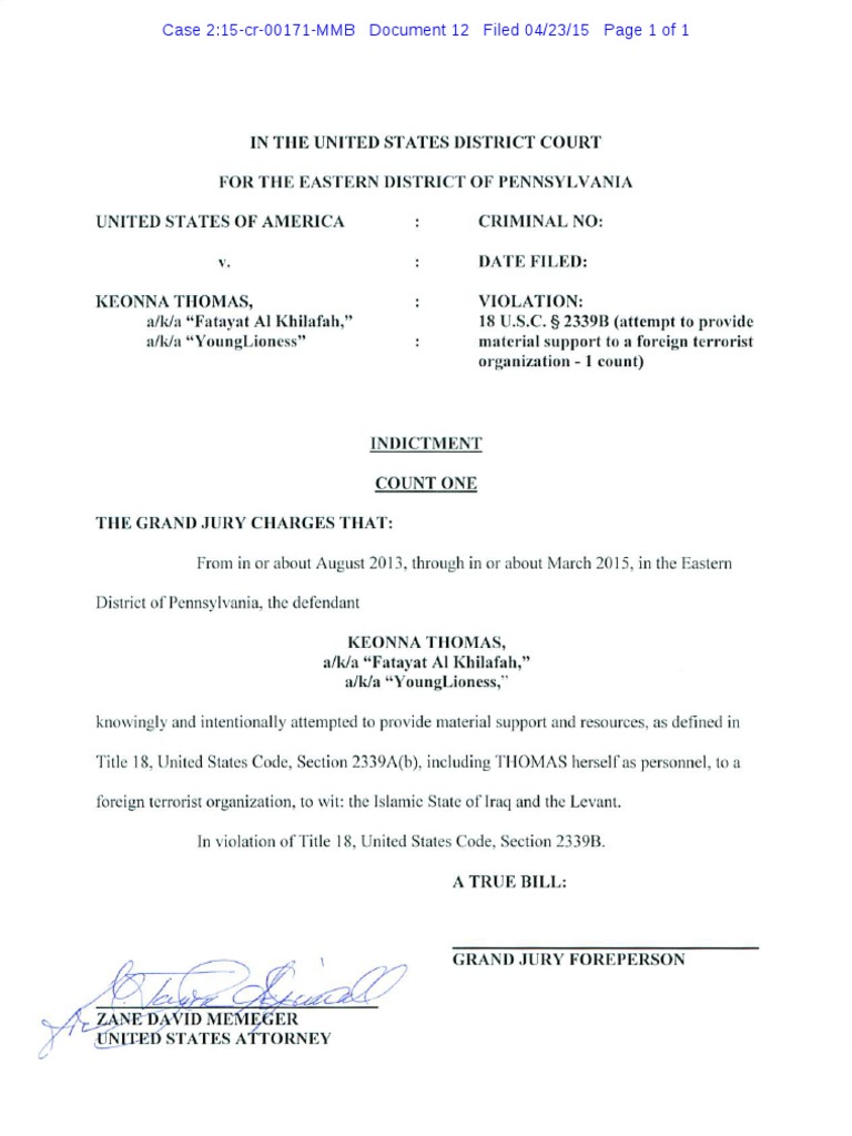 The formal indictment of Keonna Thomas, currently being held without bail in connection with charges that she attempted to join the Islamic State.