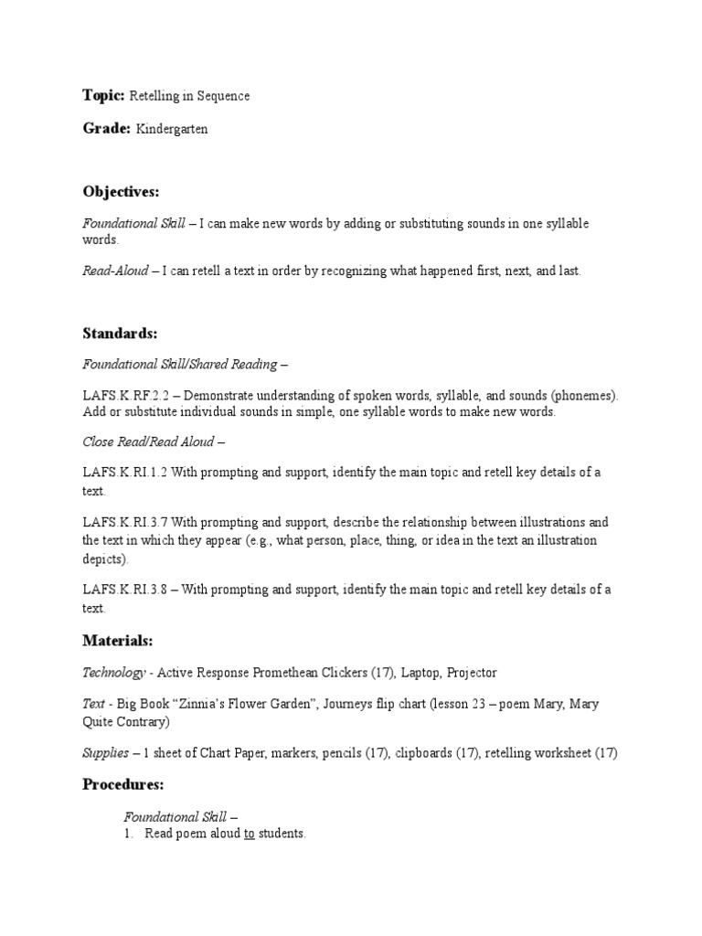 Supplies 1 sheet of Chart Paper, markers, pencils (17), clipboards (17), retelling worksheet (17)
