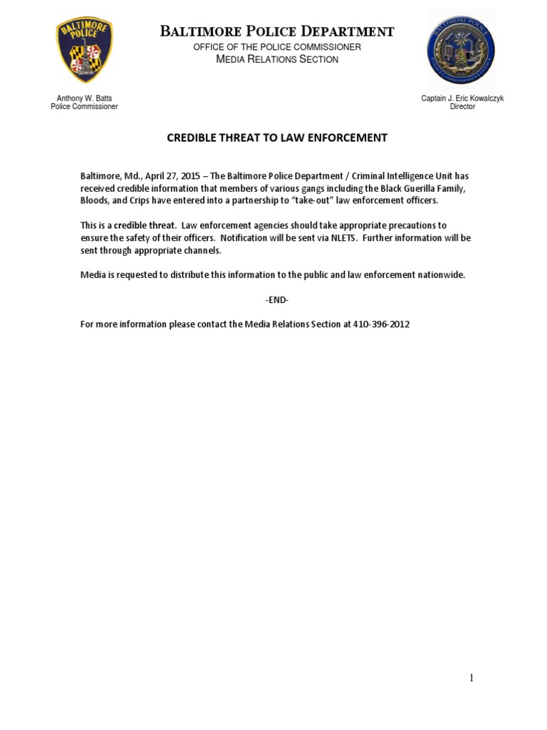 Baltimore, Md., April 27, 2015 – The Baltimore Police Department / Criminal Intelligence Unit has