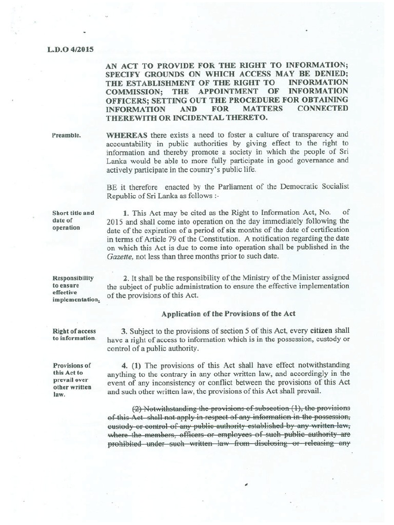 L.D.0 4/2015 Preamble. Short title and date of operation Responsibility toensure effective implementation, Right of access to information, Provisions of this Act to. prevail over other written law. AN ACT TO PROVIDE FOK THE RIGHT TO INFORMATION; SPECIFY GROUNDS ON WHICH ACCESS MAY BE DENIED; THE ESTABLISHMENT OF THE RIGHT TO INFORMATION COMMISSION; THE APPOINTMENT OF INFORMATION OFFICERS; SETTING OUT THE PROCEDURE FOR OBTAINING INFORMATION AND FOR MATTERS CONNECTED ‘THEREWITH OR INCIDENTAL THERETO. WHEREAS there exists @ need to foster a culture of transparency and accountability in public authorities by giving effect to the right to information and thereby promote a society in which the people of Sri Lanka would be able to more fully participate in good governance and actively participate in the country’s public life. BE it therefore enacted by the Parliament of the Democratic Socialist Republic of Sri Lanka as follows :- 1. This Act may be cited as the Right to Information Act, No. of 2015 and shall come into operation on the day immediately following the date of the expiration of a period of six months of the date of certification in terms of Article 79 of the Constitution. A notification regarding the date on which this Act is due to come into operation shall be published in the Gazette, not less than three months prior to such date. 2, It shall be the responsibility of the Ministry of the Minister assigned the subject of public administration to ensure the effective implementation of the provisions of this Act. Application of the Provisions of the Act 3, Subject to the provisions of section 5 of this Act, every citizen shall have a right of access to information which is in the possession, custody or control of a public authority. 4. (1) The provisions of this Act shall have effect notwithstanding anything to the contrary in any other written law, and accordingly in the event of any inconsistency or conflict between the provisions of this Act and such other written law, the provisions of this Act shall prevail. ude tuebystiondavis Denial of Access to Information ‘When right of 5. (1) Subject to the provisions of subsection (2) a request under this, access may be Act for access to information shall be refused, where ~ (a) the information which relates to personal information the disclosure of which has no relationship to any public activity or interest, or which would cause unwarranted invasion of the privacy of the individual unless the larger public interest justifies the disclosure of such information and the person concemed has consented in vmriting to such disclosure; (b) disclosure of such information ~ (i) would seriously affect the defence of the State or its territorial integrity or national security; (ji) would cause serious danger io lifeor-safety-ofany peronsor (iii) would be or is likely to be seriously prejudicial to Sri Lanka’s relations with any State or in relation to international agreements or obligations under intemational law, where such information was given by or obtained in confidence; (©) the disclosure of such information could cause serious prejudice to the economy of Sri Lanka by disclosing prematurely decisions to change or continue government economic or financial policies relating to:- (exchange rates or the control of overseas exchange transactions; Gi) the regulation of banking or credit; ii) taxation; (iv) the stability, control and adjustment of prices of goods and services, rents and other costs and rates of wages, salaries and other income; or (¥) the entering into of overseas trade agreements: (@) the disclosure of such information would reveal any trade secrets or harm the commercial interests of any person, unless that person has consented in writing to such disclosure; (©) the information could lead to the disclosure of any medical records relating to any person, unless such person has consented in writing to such disclosure; (f) the information consist of any communication which is not permitted to be disclosed under section 126 of the Evidence Ordinance; (@ the information is required to be kept confidential by reason of the existence of a fiduciary relationship; (h) the disclosure of such information could:- (cause grave prejudice to the prevention or detection of any crime or the apprehension or prosecution of offenders: (ii) enable the existence or identity of 2 confidential source of information in relation to law enforcement or national security, to be ascertained; (@ subject to the provisions of section 29 (2) (c) the information has been supplied in confidence to the public authority concemed by a third party and the third party does not consent to its disclosure; @ the disclosure of such information would be in contempt of court or infringe the privileges of Parliament; or (&) the information relates to an examination conducted by Severability under certain circumstances. Public authorities to maintain and preserve its records, Ministers duty to publish a report, the Department of Examination or a Higher Educational Institution which is required to be kept confidential, a ra nee eer omen) Bsa S Pere aU na erent Oe eee ee eae) Se teieee i ae oe reenees, oF foe eo (2) Notwithstanding the provisions of subsection (1), a request for information shall not be refused on any of the grounds referred to therein, other than the grounds referred to in paragraphs (a), (b),(e), (£) and (g) of that subsection, if the information requested for is over ten years old, (3) An information officer shall seek the advice of the Commission within fourteen days. With regard to an issue connected with the grant of access to any information which is exempted from being disclosed under subsection (1). 6. Where a request for information is refused on any of the grounds referred to in section 5, access may nevertheless be given to that part of any record or document which contains any information that is not exempted from being disclosed under that s