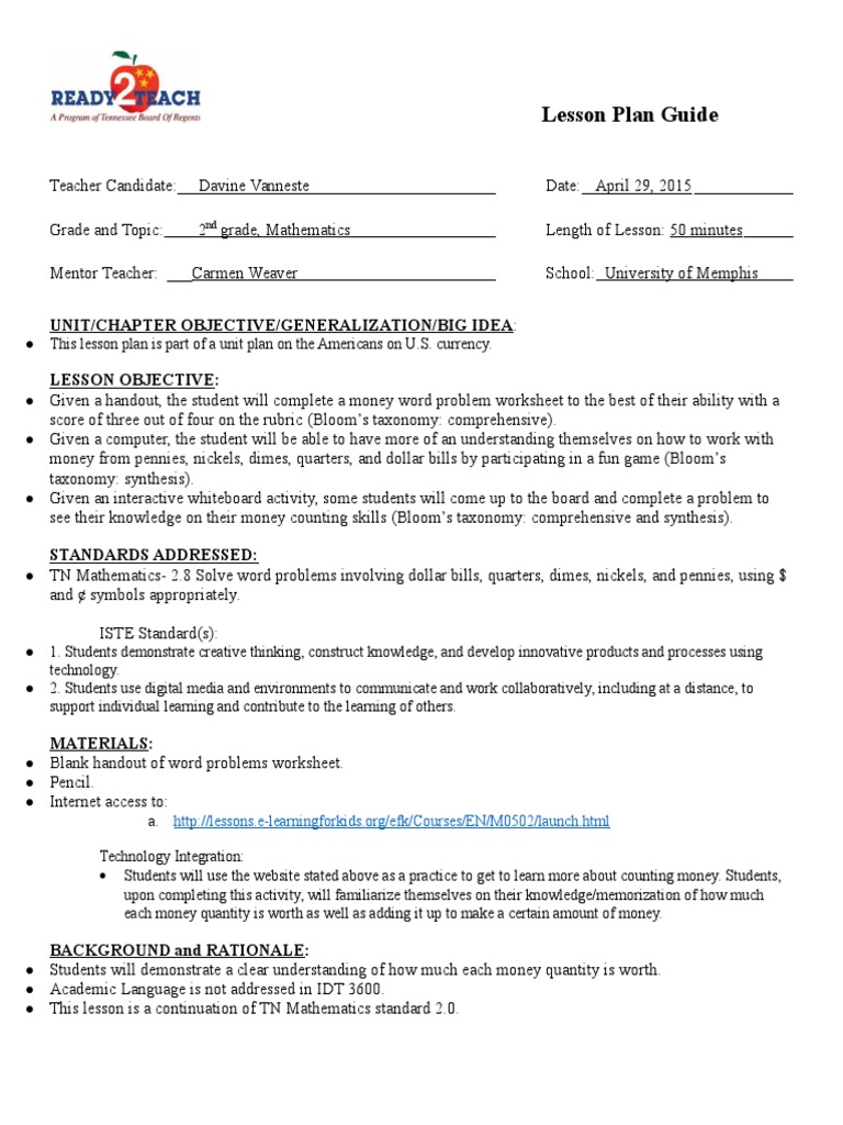 regarding U.S. currency. At the end of the class, the teacher will go over what they learned for