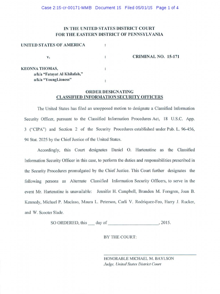Government's motion to designate a Classified Information Security Officer to secure classified information in the custody of the US District Court for the Eastern District of Pennsylvania relating to the case of United States v. Thomas.