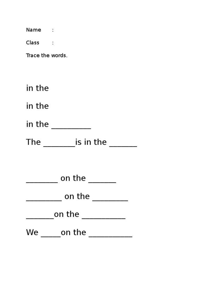 This short document appears to be a beginning reading exercise where the student traces and completes words related to locations like "in" and "on" to practice prepositions of place. The student traces the phrase "in the" three times and completes the sentence "The ________is in the _______" to reinforce that concept. Similarly, the student traces "________ on the _______" four times to practice the preposition "on".