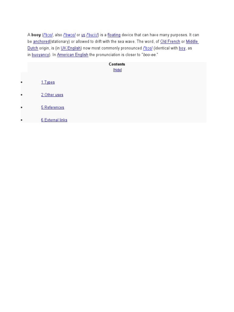 A buoy (/b/, also /bw/ or US /bui/) is a floating device that can have many purposes.