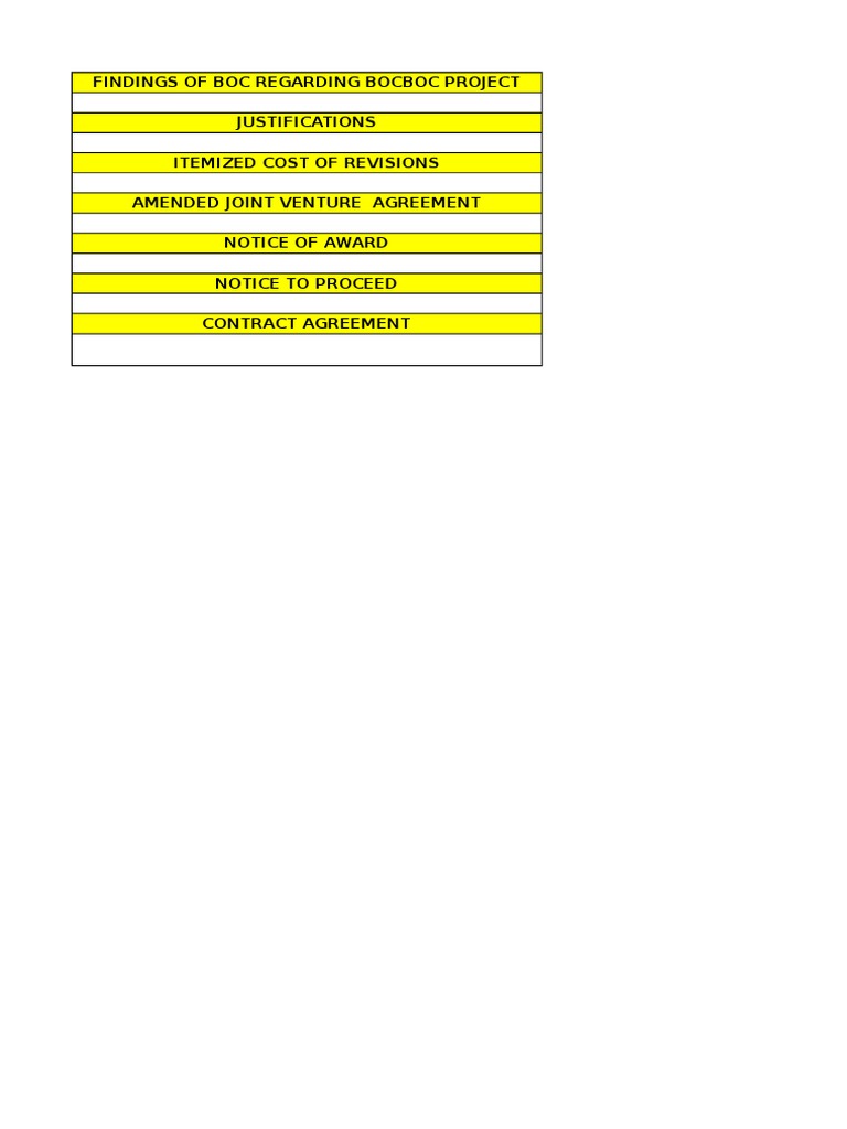 The document discusses a project by the BOC and BOCBOC joint venture. It contains findings by the BOC regarding the project and outlines cost justifications, a revised joint venture agreement, a notice of award, and a contract agreement to move forward with the project.