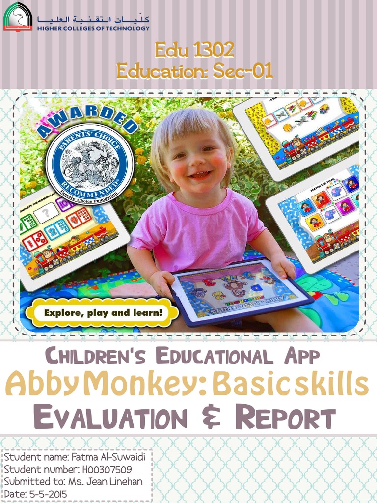 This document appears to be an evaluation report for an educational app designed for children in an Education 1302 Secondary Education class numbered Section 01. The report evaluates and provides details on a children's educational application that was likely created or reviewed as part of an assignment for the education course.
