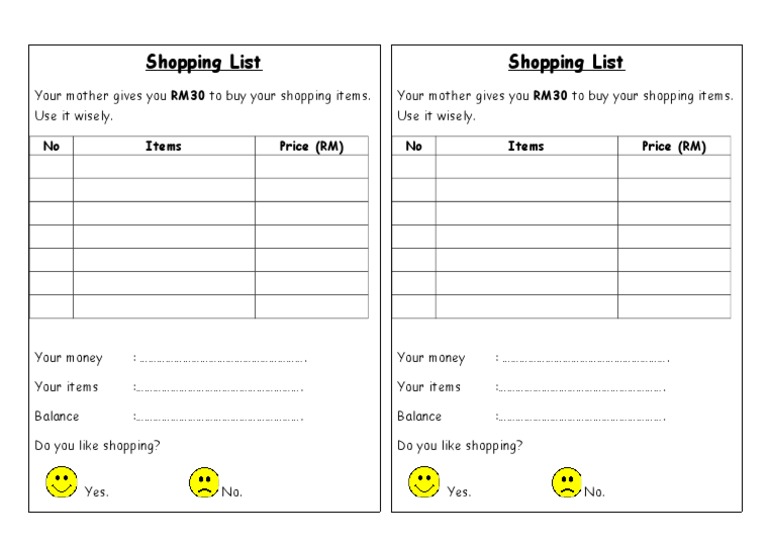 Your mother gave you RM30 to buy shopping items. She told you to use the money wisely. The document is a shopping list template where you can list the items you want to buy, their prices, and calculate your balance. It asks if you like shopping, with options to respond yes or no.