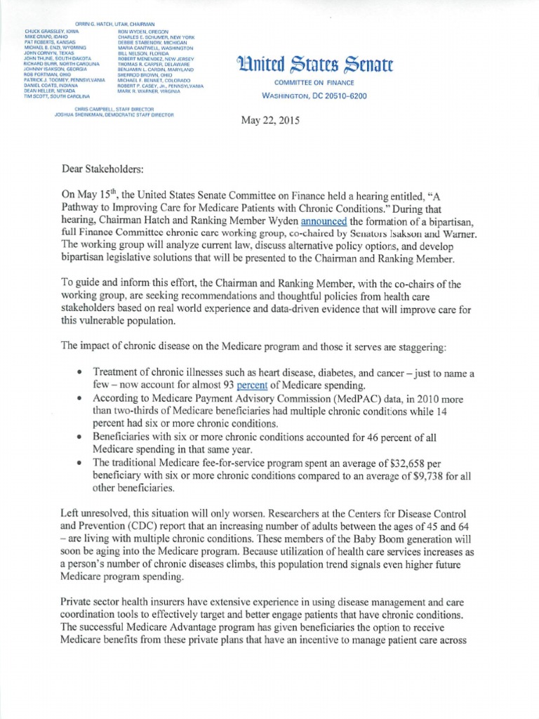 Senate Finance Committee members Sens. Mark R. Warner (D-VA) and Johnny Isakson (R-GA) announced the formation of a bipartisan working group to begin exploring solutions to improve outcomes for Medicare patients requiring chronic care. As part of these efforts, Sens. Warner and Isakson today sent a letter requesting input from healthcare stakeholders as they work to develop bipartisan legislative solutions.