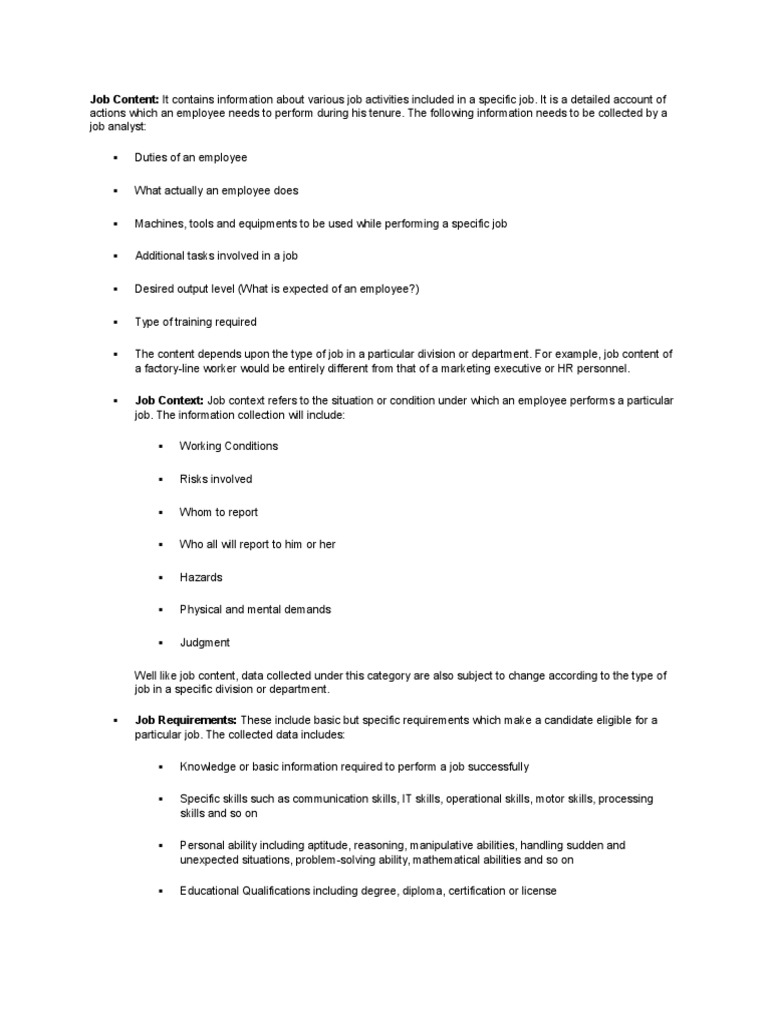 The content depends upon the type of job in a particular division or department. For example, job content of