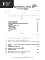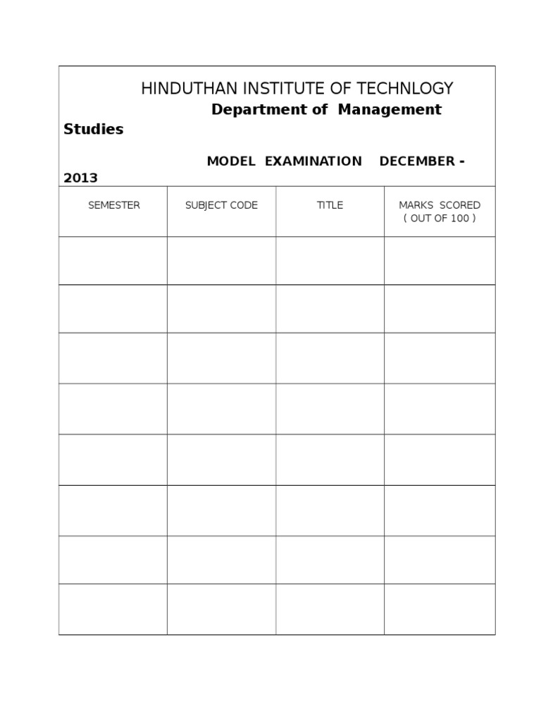 The document provides information about an exam taken in December 2013 at Hinduthan Institute of Technology for a management studies subject, including the subject code, title, and marks scored out of 100.