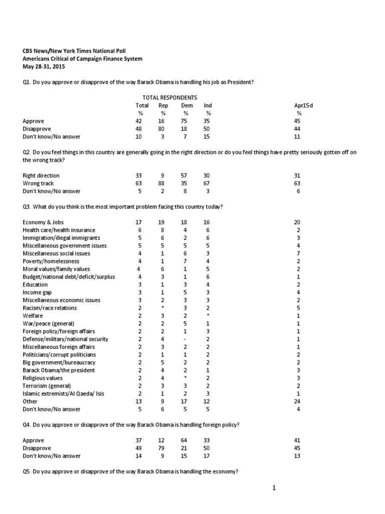 Q1. Do you approve or disapprove of the way Barack Obama is handling his job as President? TOTAL RESPONDENTS TotalRepDemIndApr15d % % % % % Approve4216753545 Disapprove4880185044 Don't know/No answer10 3 71511 Q2. Do you feel things in this country are generally going in the right direction or do you feel things have pretty seriously gotten off on the wrong track? Right direction33 9573031 Wrong track6388356763 Don't know/No answer 5 2 8 3 6 Q3. What do you think is the most important problem facing this country today? Economy & Jobs1719181620 Health care/health insurance 6 8 4 6 2 Immigration/illegal immigrants 5 6 2 6 3 Miscellaneous government issues 5 5 5 5 4 Miscellaneous social issues 4 1 6 3 7 Poverty/homelessness 4 1 7 4 2 Moral values/family values 4 6 1 5 2 Budget/national debt/deficit/surplus 4 3 1 6 1 Education 3 1 3 4 2 Income gap 3 1 5 3 4 Miscellaneous economic issues 3 2 3 3 2 Racism/race relations 2 * 3 2 5 Welfare 2 3 2 * 1 War/peace (general) 2 2 5 1 1 Foreign policy/foreign affairs 2 2 1 3 1 Defense/military/national security 2 4 - 2 1 Miscellaneous foreign affairs 2 3 2 2 1 Politicians/corrupt politicians 2 1 1 2 2 Big government/bureaucracy 2 5 2 2 2 Barack Obama/the president 2 4 2 1 3 Religious values 2 4 * 2 3 Terrorism (general) 2 3 3 2 2 Islamic extremists/Al Qaeda/ Isis 2 1 2 3 1 Other13 9171224 Don't know/No answer 5 6 5 5 4 Q4. Do you approve or disapprove of the way Barack Obama is handling foreign policy? Approve3712643341 Disapprove4979215045 Don’t know/No answer14 9151713 Q5. Do you approve or disapprove of the way Barack Obama is handling the economy?