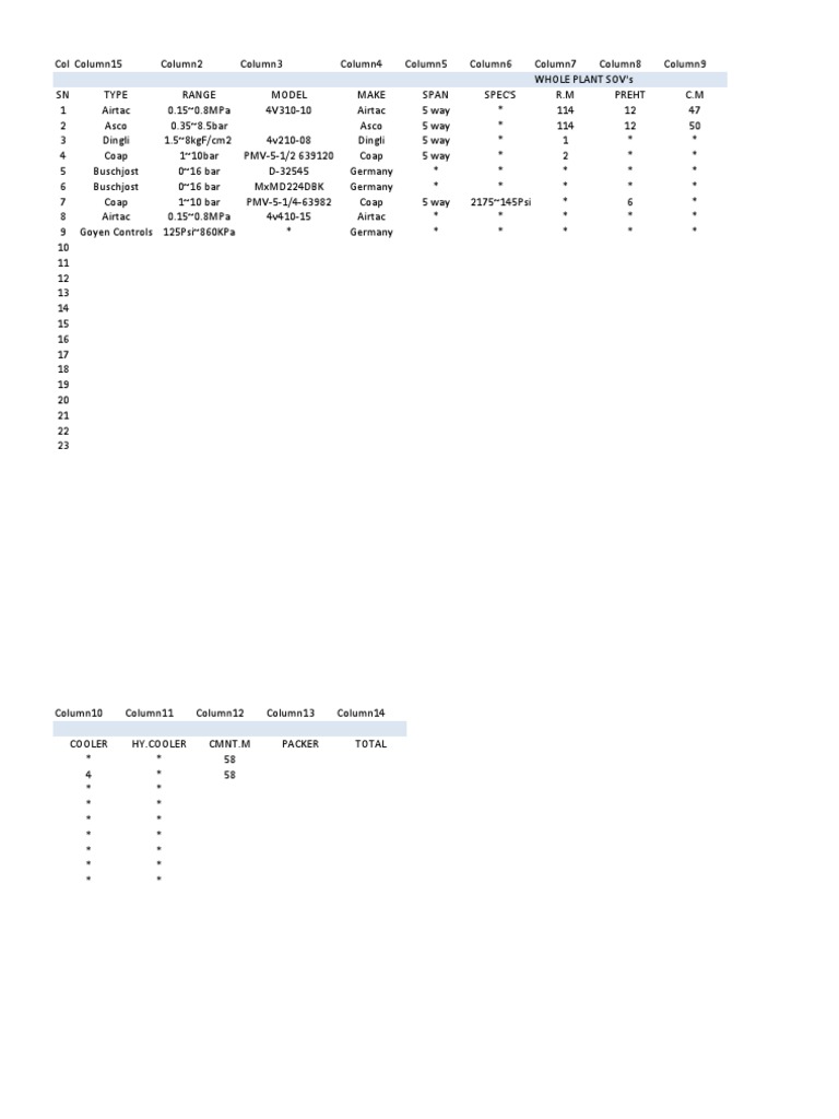 SN TYPE RANGE MODEL MAKE SPAN SPEC'S R.M PREHT C.M COOLER [Link] CMNT.M PACKER TOTAL