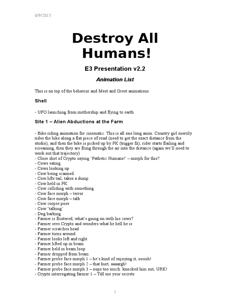 - $i%e ridin" animation for !inemati!& This is all one lon" anim& 'ontr# "irl merril# rides the bi%e alon" a flat pie!e of road (need to "et the e)a!t distan!e from the stdio*+ and then the bi%e is pi!%ed p b# , (tri""er f)*+ rider starts flailin" and s!reamin"+ then the# are fln" thro"h the air into the distan!e (a"ain .ell need to .or% ot that trae!tor#*- 'lose shot of 'r#pto sa#in" ,atheti! mans3 4 morph for this- 'o.s eatin"- 'o.s loo%in" p- 'o. bein" s!anned- 'o. lifts tail+ ta%es a dmp- 'o. held in , - 'o. !ollidin" .ith somethin"- 'o. fa!e morph 4 terror - 'o. fa!e morph 4 tal% - 'o. !orpse pose- 'o. tal%in"- o" bar%in"- Farmer is flstered+ .hats "oin" on .ith his !o.s- Farmer sees 'r#pto and .onders .hat he hell he is- Farmer s!rat!hes head- Farmer trns arond- Farmer loo%s left and ri"ht- Farmer lifted p in beam- Farmer held in beam loop- Farmer dropped from beam- Farmer probe fa!e morph 1 4 hes %ind of eno#in" it+ ooooh3- Farmer probe fa!e morph 2 4 that hrt+ aaaar"h3- Farmer probe fa!e morph 7 4 oops too m!h %no!%ed him ot+ U83- 'r#pto interro"atin" farmer 1 4 Tell me #or se!rets1