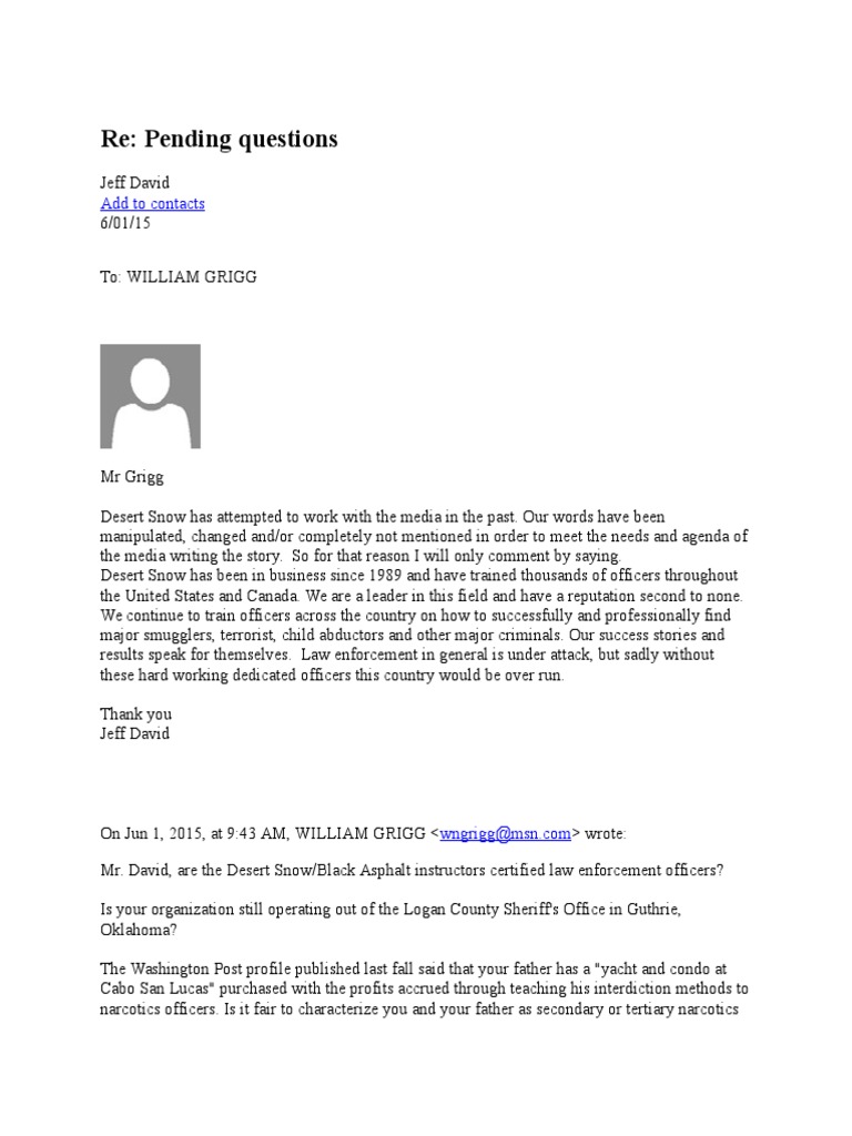Jeff David Add to contacts 6/01/15 To: WILLIAM GRIGG Mr GriggDesert Sno !as atte"#ted to or$ it! t!e "edia in t!e #ast% &'r ords !ave (een "ani#')ated* c!anged and/or co"#)ete)+ not "entioned in order to "eet t!e needs and agenda of t!e "edia riting t!e stor+% So for t!at reason I i)) on)+ co""ent (+ sa+ing% Desert Sno !as (een in ('siness since 1,-, and !ave trained t!o'sands of officers t!ro'g!o't t!e .nited States and anada% We are a )eader in t!is fie)d and !ave a re#'tation second to none% We contin'e to train officers across t!e co'ntr+ on !o to s'ccessf'))+ and #rofessiona))+ find "aor s"'gg)ers* terrorist* c!i)d a(d'ctors and ot!er "aor cri"ina)s% &'r s'ccess stories and res')ts s#ea$ for t!e"se)ves% La enforce"ent in genera) is 'nder attac$* ('t sad)+ it!o't t!ese !ard or$ing dedicated officers t!is co'ntr+ o')d (e over r'n% T!an$ +o' Jeff David &n J'n 1* 015* at ,:23 AM* WILLIAM GRIGG 4ngrigg"sn%co" rote:Mr% David* are t!e Desert Sno/7)ac$ As#!a)t instr'ctors certified )a enforce"ent officers8Is +o'r organi9ation sti)) o#erating o't of t!e Logan o'nt+ S!eriffs &ffice in G't!rie* &$)a!o"a8T!e Was!ington ;ost #rofi)e #'()is!ed )ast fa)) said t!at +o'r fat!er !as a <+ac!t and condo at a(o San L'cas< #'rc!ased it! t!e #rofits accr'ed t!ro'g! teac!ing !is interdiction "et!ods tonarcotics officers% Is it fair to c!aracteri9e +o' and +o'r fat!er as secondar+ or tertiar+ narcotics