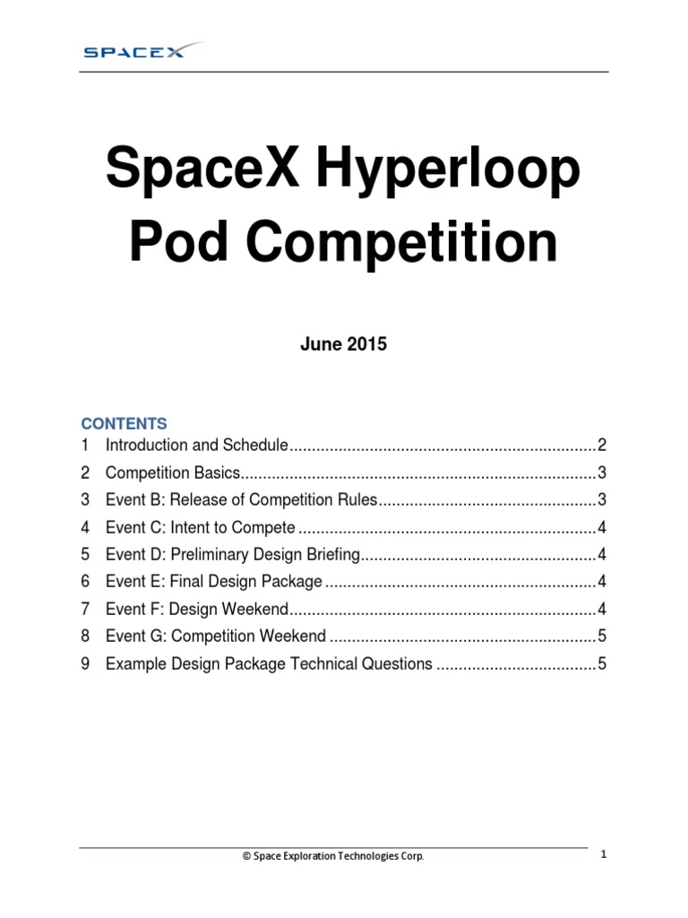 A 6/2015 Summary document issued (this document) B 8/15/2015 Detailed rules, criteria, and tube specifications released by SpaceX C 9/15/2015 Deadline for entrants to submit their Intent to Compete D 10/15/2015 Deadline for entrants to submit Preliminary Design Briefing E 12/15/2015 Entrants submit Final Design Package F 1/9/2016 In-person design weekend with all entrants. Texas A&M University, College Station, Texas. G 6/2016 Competition weekend. All pods compete at the SpaceX Hyperloop Test Track in Hawthorne, California. Exact date TBA.