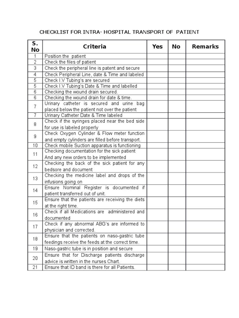 CHECKLIST FOR INTRA- HOSPITAL TRANSPORT OF PATIENT