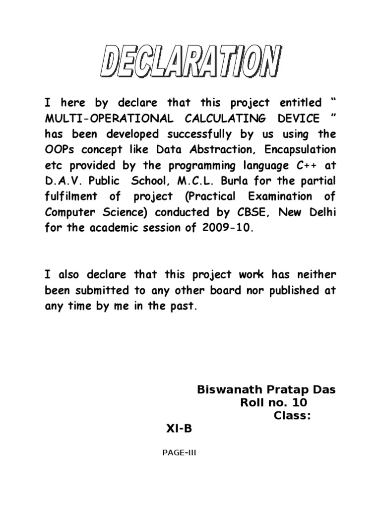 I also declare that this project work has neither