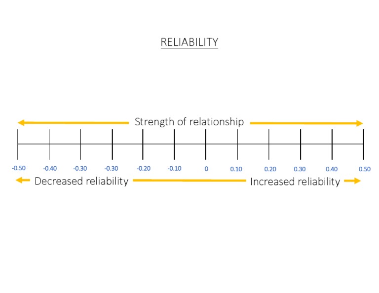The document shows a scale measuring the strength of relationship between -0.50 and 0.50, with negative numbers indicating decreased reliability and positive numbers indicating increased reliability. The document appears to be measuring the reliability of something that has a relationship between -0.30 and -0.30, indicating a decreased reliability according to the scale provided.