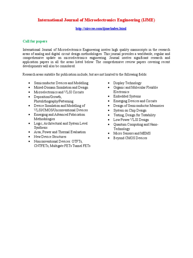 International Journal of Microelectronics Engineering invites high quality manuscripts in the research