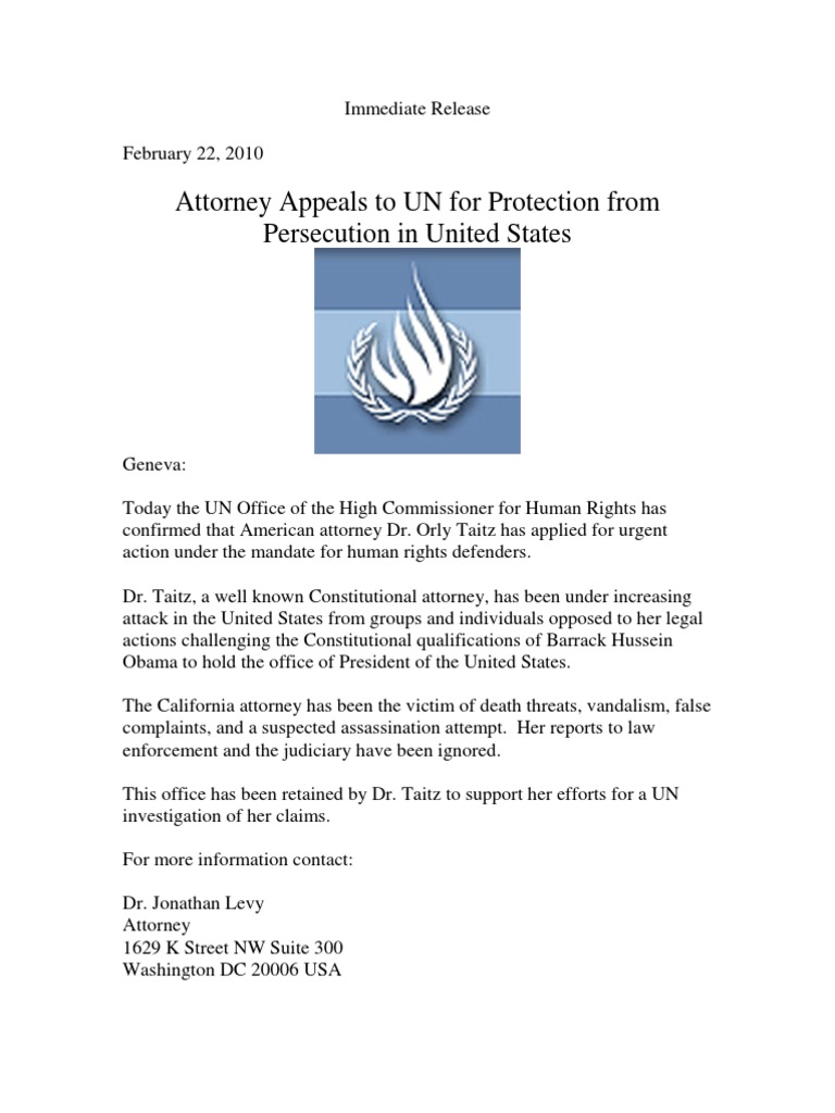Geneva: Today the UN Office of the High Commissioner for Human Rights has confirmed that American attorney Dr. Orly Taitz has applied for urgent action under the mandate for human rights defenders. Dr. Taitz, a well known Constitutional attorney, has been under increasing attack in the United States from groups and individuals opposed to her legal actions challenging the Constitutional qualifications of Barrack Hussein Obama to hold the office of President of the United States. The California attorney has been the victim of death threats, vandalism, false complaints, and a suspected assassination attempt. Her reports to law enforcement and the judiciary have been ignored. This office has been retained by Dr. Taitz to support her efforts for a UN investigation of her claims. For more information contact: Dr. Jonathan Levy Attorney 1629 K Street NW Suite 300 Washington DC 20006 USA