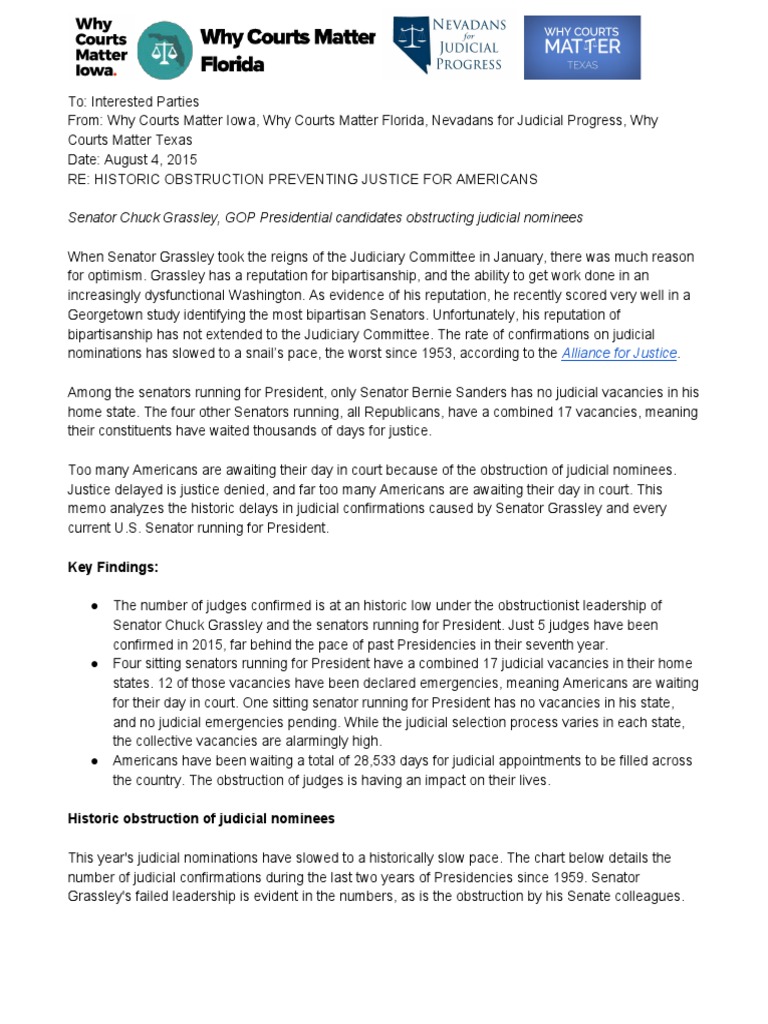 memoanalyzesthehistoricdelaysinjudicialconfirmationscausedbySenatorGrassleyandevery