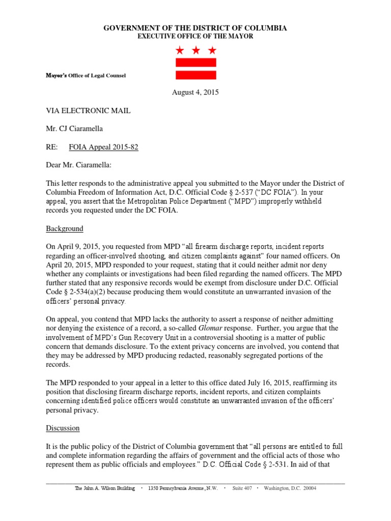 Office of D.C. Mayor decision in FOIA appeal 2015-82 by CJ Ciaramella