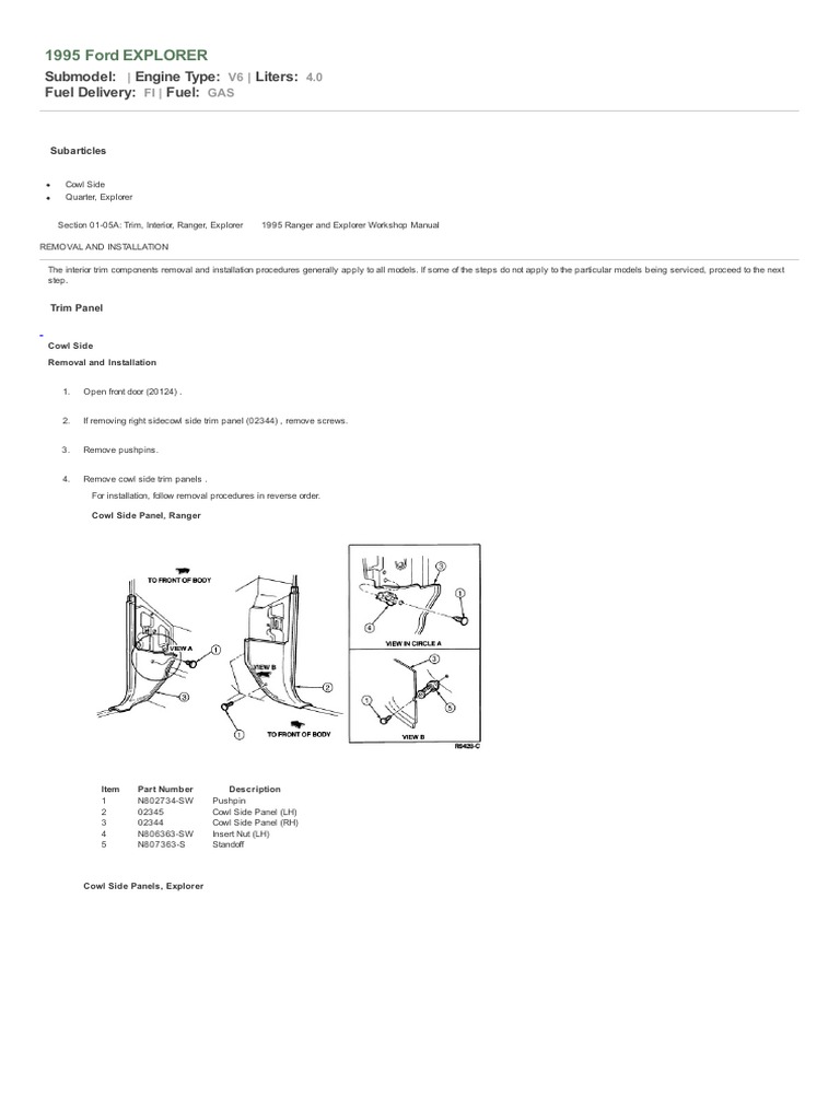 This document provides removal and installation instructions for various interior trim components on 1995 Ford Explorer and Ranger models, including: - Cowl side trim panels are removed by taking out screws and pushpins. - Quarter trim panels on Explorer are removed by taking out various attaching screws, pushpins, door components, and seat belts. - Detailed part numbers and descriptions are provided for cowl side and quarter trim panels on both Ranger and Explorer.